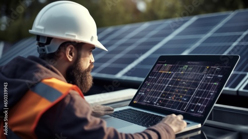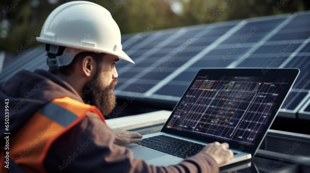 The watermark will not be included on Wall mural.: Installing solar panels for sustainable energy electrical engineer holds laptop computer with solar