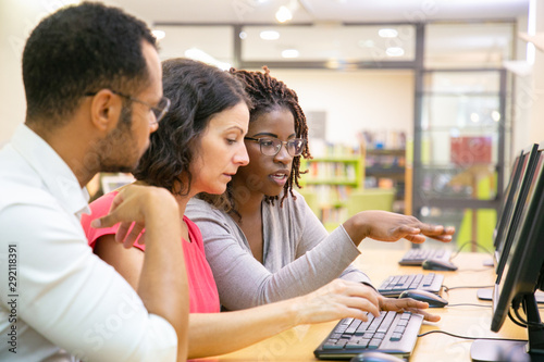 Wall mural instructor explaining corporate software specific to trainees in computer class. man and women sitti