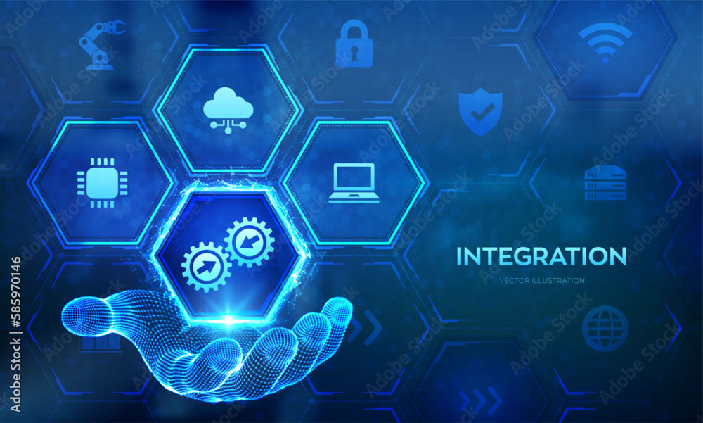 The watermark will not be included on Wall mural.: Integration data system - system integration technology concept in wireframe hand - industrial and sma