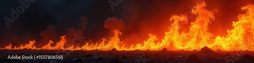 The watermark will not be included on Wall mural.: Intense, vibrant flames engulf a dark background, creating a dramatic and powerful image of uncontro