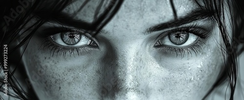The watermark will not be included on Wall mural.: Intense black and white portrait highlighting a womans striking eyes with sharp contrasts between sh
