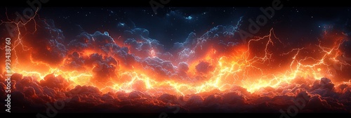 Wall mural : Intense fiery lightning storm with glowing red and orange clouds creating a dramatic and powerful co
