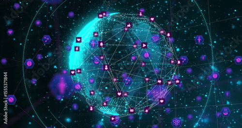 The watermark will not be included on Wall mural.: Interconnected icons glowing over globe in digital network image design
