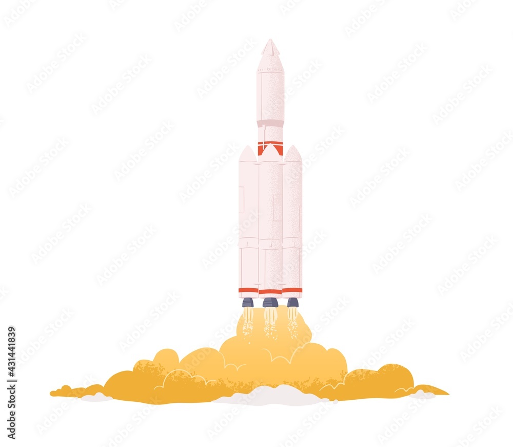 Wall mural intergalactic rocket launch. spaceship takeoff with fire flames from engine. spacecraft taking off.