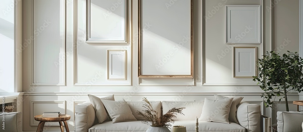 Wall mural : Interior with wall and table photo frames creating a charming ambiance with copy space image