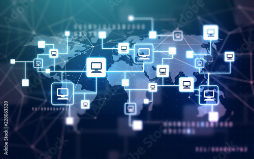 Wall mural : Internet connection, networking and technology concept - virtual computer network and world map over