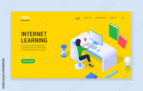 Wall mural : Internet learning concept - landing page website banner template with woman at desk studying online f