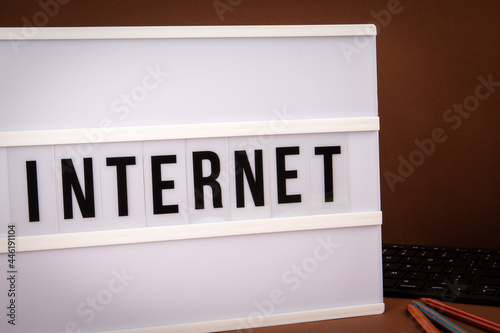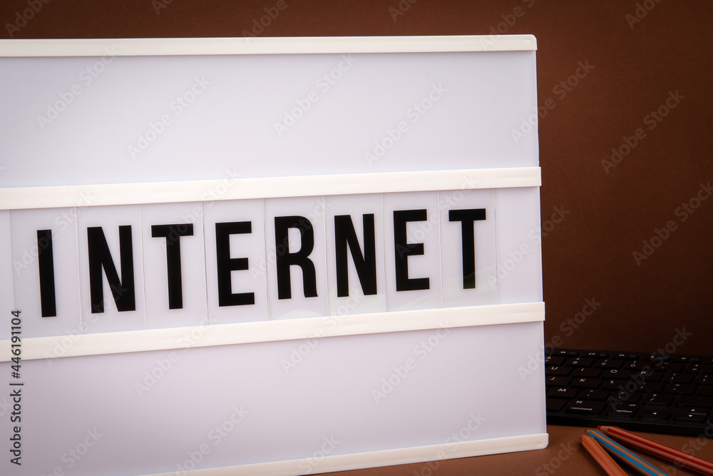 Wall mural internet. light box with text and computer keyboard on a brown background