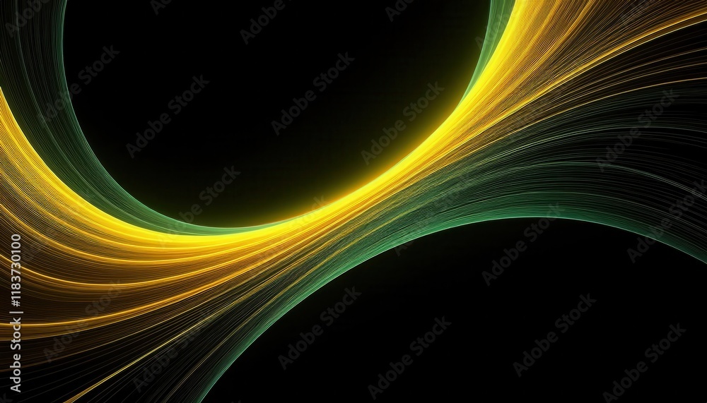 The watermark will not be included on Wall mural.: Intertwined golden and green light trails on a black background, forming an abstract flowing wave pa