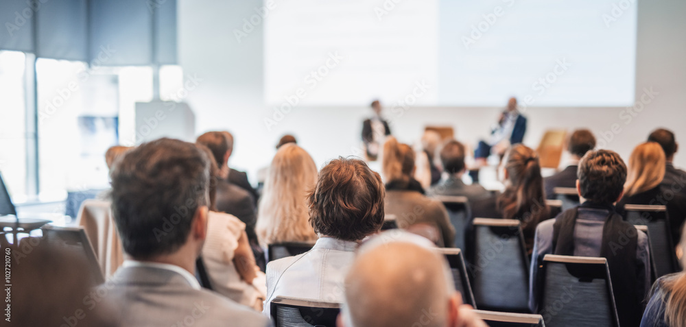 The watermark will not be included on Wall mural.: Interview and round table discussion at business convention and presentation - audience at the confer