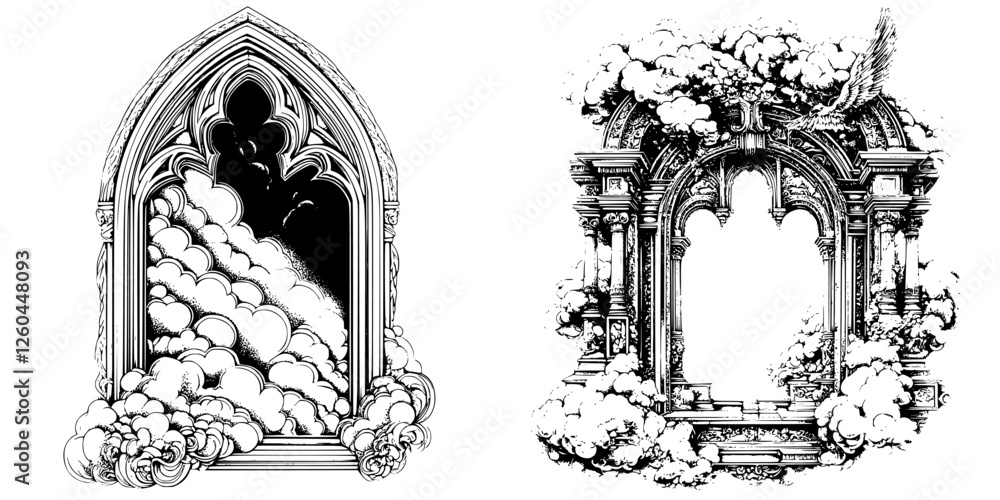 Intricate black and white illustrations of gothic arches with cloud motifs and empty spaces for creaWall mural