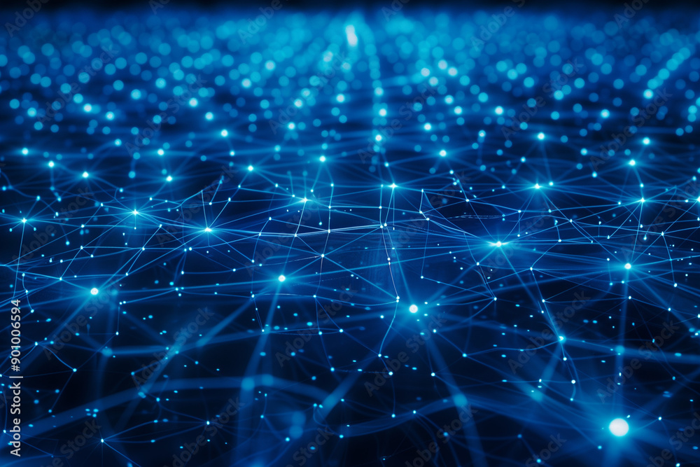 Wall mural intricate network of blue light points creating a dynamic digital mesh in a dark background represen