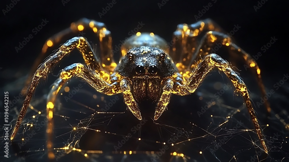 The watermark will not be included on Wall mural.: Intricate web creation by a golden spider highlighted in a dark minimal backdrop