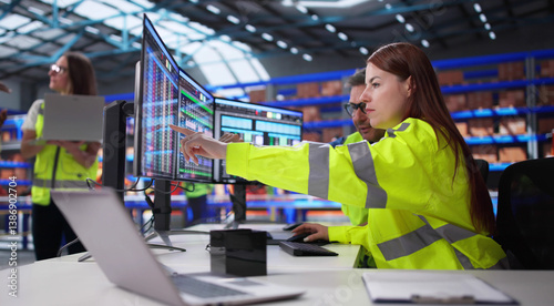 The watermark will not be included on Wall mural.: Inventory manager inputs data on computer screen in warehouse office