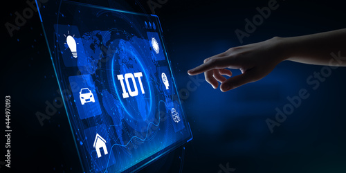 Wall mural : Iot internet of things wireless technology concept - hand pressing button on screen -
