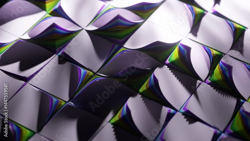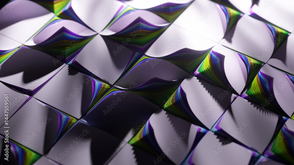 The watermark will not be included on Wall mural.: Iridescent geometric shapes morphing and flowing dynamically across white background, creating vibra