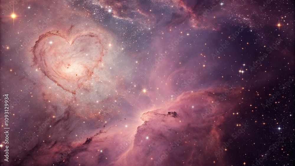 The watermark will not be included on Wall mural.: Iridescent nebula-inspired rose gold and purple background with a subtle abstract heart shape, ether