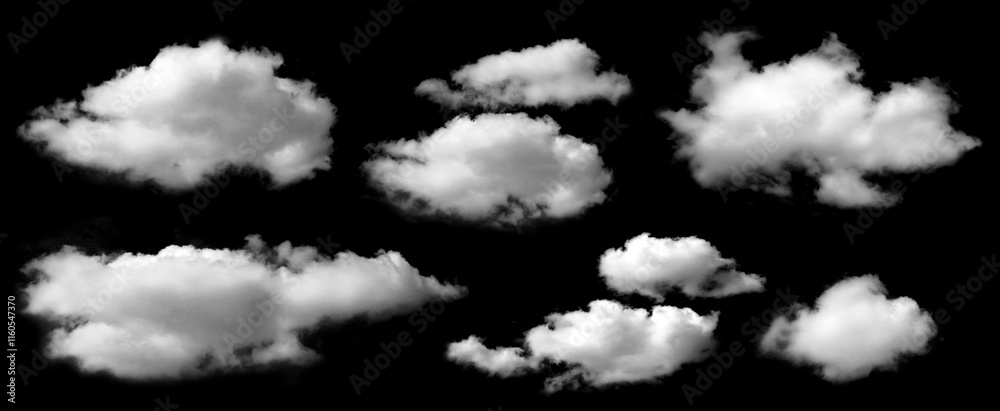 Wall mural isolated cloud collection on black background. set of different types of clouds. design. fog. haze.