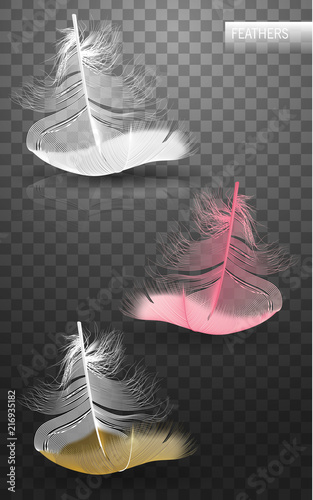 Wall mural : Isolated falling fluffy twirled feathers on transparent background in realistic style - vector illust