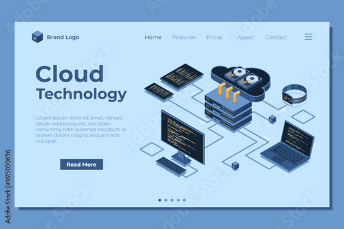 The watermark will not be included on Wall mural.: Isometric cloud technology computing landing page - isometric network with computer, laptop, tablet,