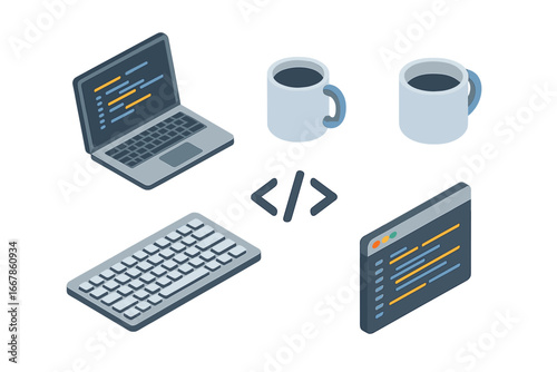 Wall mural isometric coding icon set. web and software development concept. programmer workspace elements. lapt