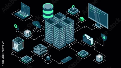 Wall mural isometric computer technology animation. computation of big data center. cloud computing. online dev - Wall murals Wall mural isometric computer technology animation. computation of big data center. cloud computing. online dev - Wall murals