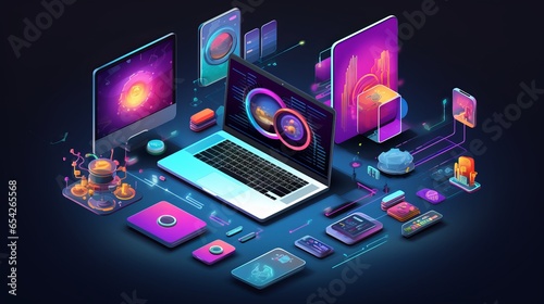 The watermark will not be included on Wall mural.: Isometric computer technology illustration with pc, laptop, and mobile devices on desk - programming