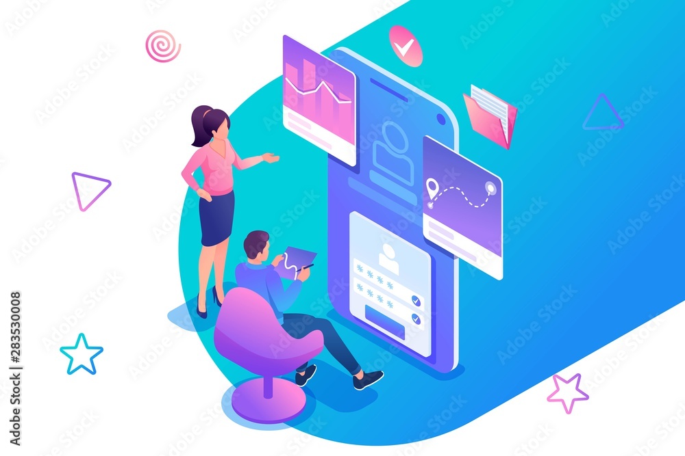 The watermark will not be included on Wall mural.: Isometric concept young people are engaged in testing the mobile application, the work of the progra