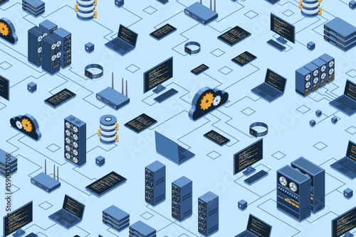 Wall mural isometric data network management. cloud storage data and synchronization of devices. networking, da