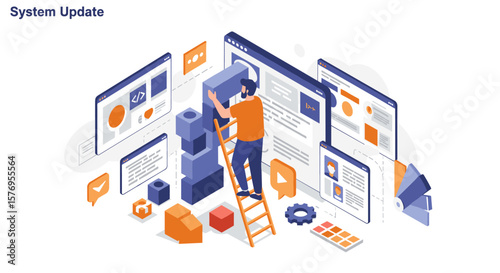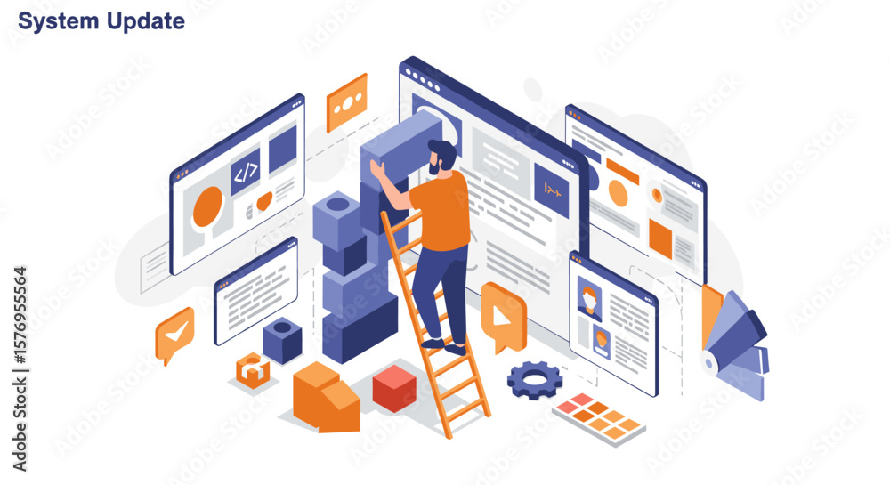The watermark will not be included on Wall mural.: Isometric design of system update with web interfaces and analytics