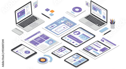 The watermark will not be included on Wall mural.: Isometric digital workspace vector illustration for design and technology concepts