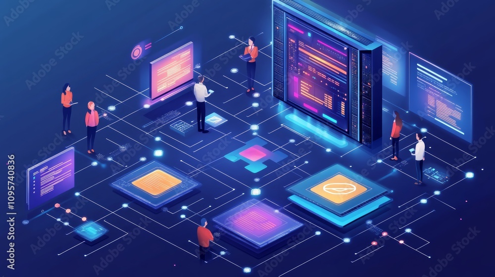 The watermark will not be included on Wall mural.: Isometric illustration of data center with programmers working on server -