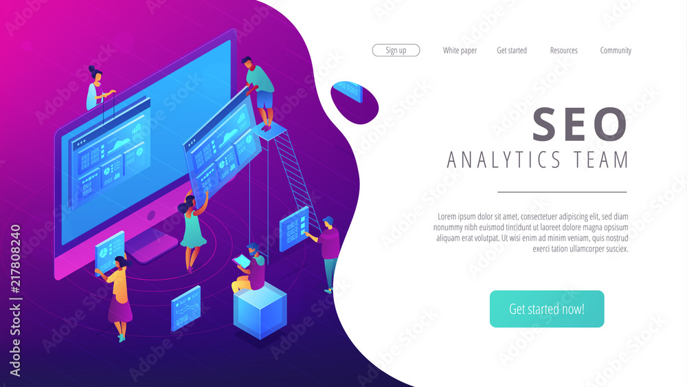 Wall mural : Isometric seo specialists working with web pages and charts landing page - seo analysis and optimizat