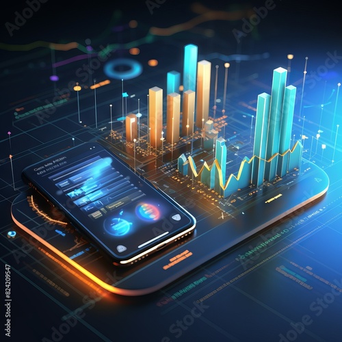 The watermark will not be included on Wall mural.: Isometric smartphone displaying business graph and analytics data for trend analysis and software de