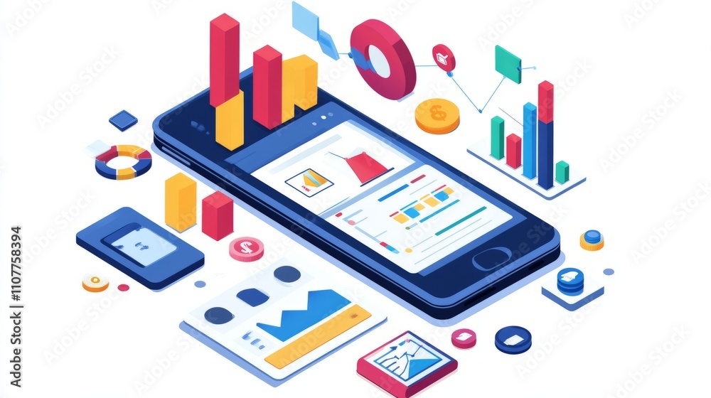 Wall mural : Isometric technology background featuring smartphone with business graphs, data analytics trends, an