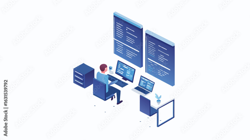 The watermark will not be included on Wall mural.: Isometric view of a developer working with multiple screens and a laptop in a modern workspace setup