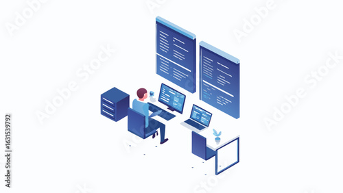 Isometric view of a developer working with multiple screens and a laptop in a modern workspace setupWall mural