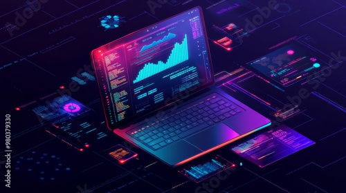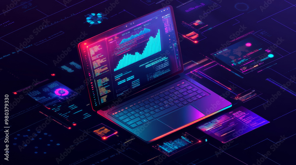 Wall mural : Isometric view of a laptop displaying business graphs and analytics data - concept of trend analysis