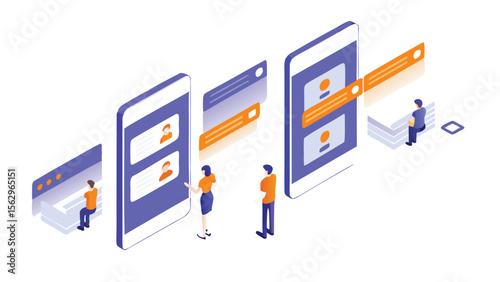 Wall mural isometric view of mobile app data transfer with people and interface elements shown clearly - Wall murals Wall mural isometric view of mobile app data transfer with people and interface elements shown clearly - Wall murals