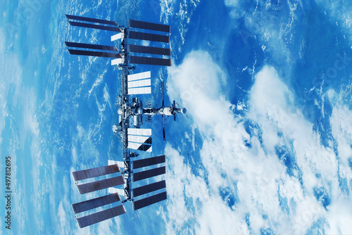 Wall mural : Iss over the planet, against the background of clouds - elements of this image furnished by nasa