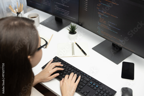 Wall mural : It developer woman coding on laptop screen at back side view, creating social media website system a