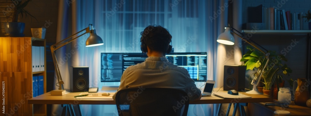 Wall mural it developer working online software development on pc monitors at modern home office on coding appl - Wall murals Wall mural it developer working online software development on pc monitors at modern home office on coding appl - Wall murals
