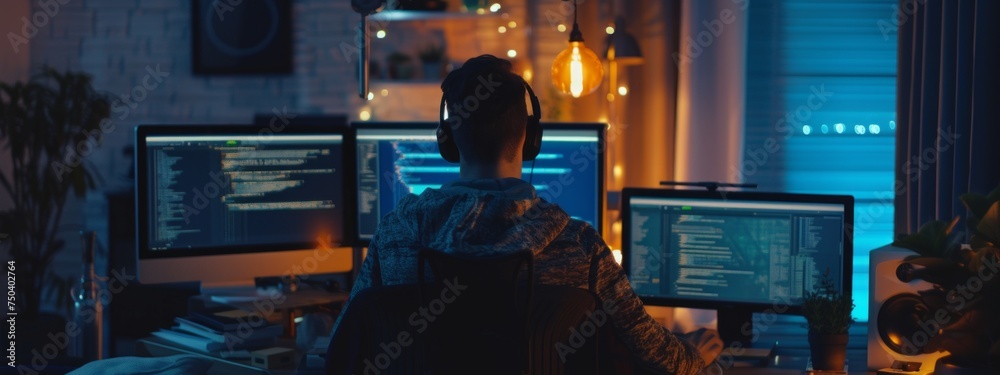 Wall mural it developer working online software development on pc monitors at modern home office on coding appl - Wall murals Wall mural it developer working online software development on pc monitors at modern home office on coding appl - Wall murals