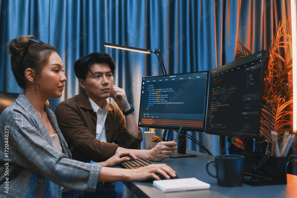 Wall mural it developers discussing with point to intelligent website development coder system running data onl - Wall murals Wall mural it developers discussing with point to intelligent website development coder system running data onl - Wall murals