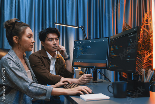 Wall mural : It developers discussing with point to intelligent website development coder system running data onl