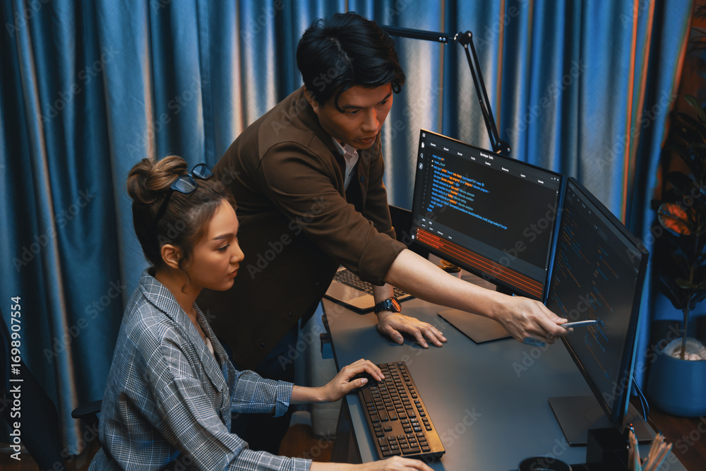 Wall mural : It developers discussing with point to intelligent website development coder system running data onl