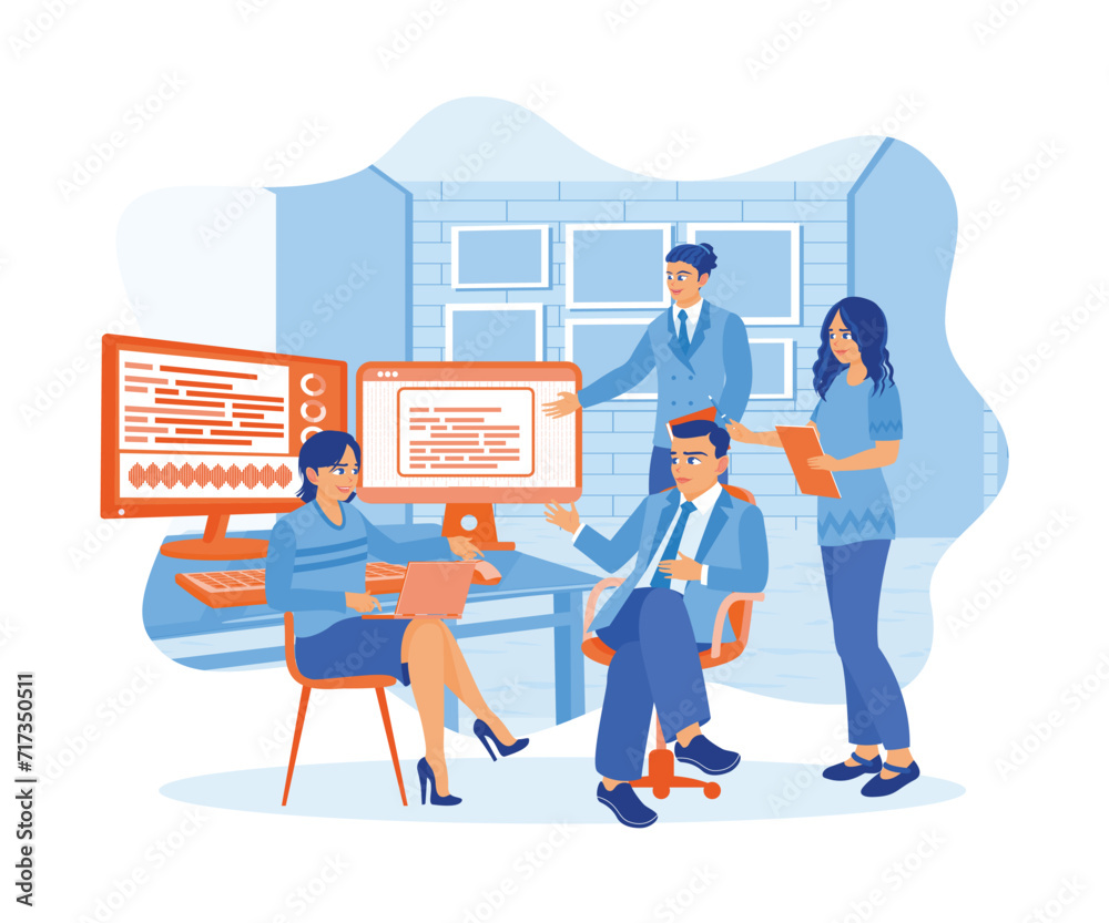 Wall mural it expert discusses with several colleagues in the office. discusses the idea of ​​developing softwa - Wall murals Wall mural it expert discusses with several colleagues in the office. discusses the idea of ​​developing softwa - Wall murals