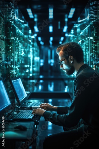 The watermark will not be included on Wall mural.: It professional admin using laptop computer doing data transfer operation with rack server cabinets