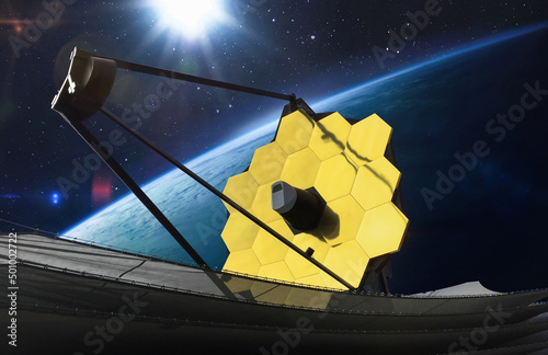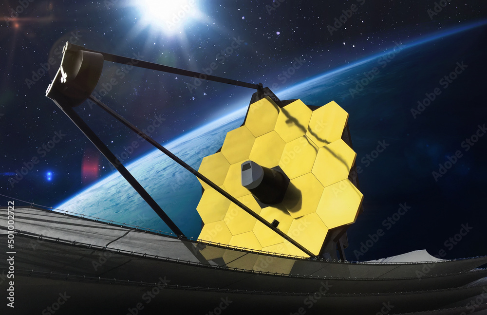 Wall mural james webb telescope in outer space. jwst observatory far galaxy explore. observatory on orbit of ea - Wall murals Wall mural james webb telescope in outer space. jwst observatory far galaxy explore. observatory on orbit of ea - Wall murals