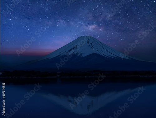 The watermark will not be included on Wall mural.: Japan icon mt fuji at night and universe space and milky way galaxy with stars on night sky backgrou
